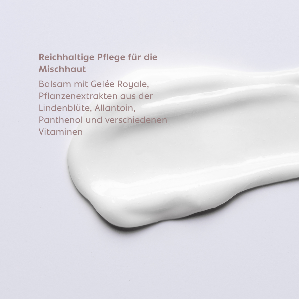 Die Haut im Gleichgewicht zu halten, ist für Mischhaut oft eine Herausforderung. Der LINDENBLÜTEN BALSAM verbindet pflegendes Gelée Royale mit besänftigenden Lindenblütenextrakten. Er spendet Feuchtigkeit, mindert Spannungsgefühle und wirkt ausgleichend bei übermäßiger Talgproduktion. Das Hautbild erscheint ebenmäßiger und wohltuend gepflegt.